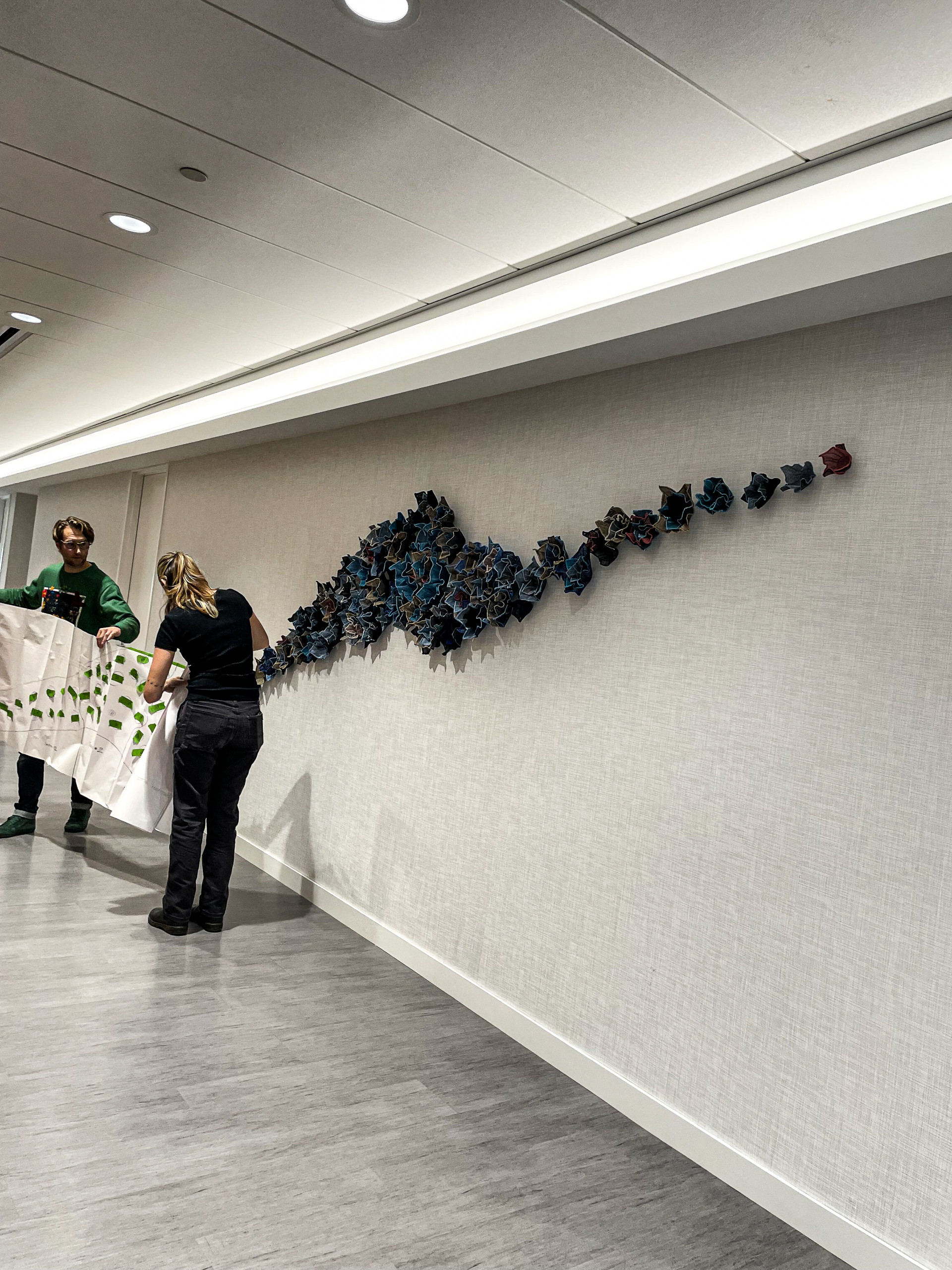 Today, Brent Thompson and Abby Bulger helped wrangle things around under my direction. You can see the installation map I made. Each floral element had a numbered, assigned spot in the design. They were marked with green tape and bagged by section. Each part was installed with staples. The installation of RARE CURRENT began with section 3 and worked outward in both directions. In the third photo, Abby and Brent are folding up the map…which will go in my archives! In the last photo, you can see the designer in charge of the process, Alycia Rubio (from Tiffany Hanken Design), Abby, and Brent wielding paint markers to camouflage the staples.